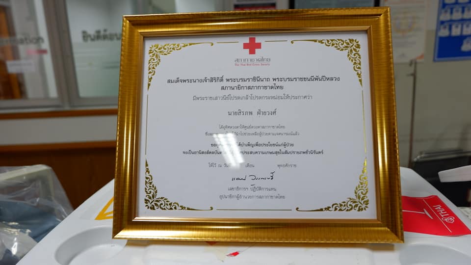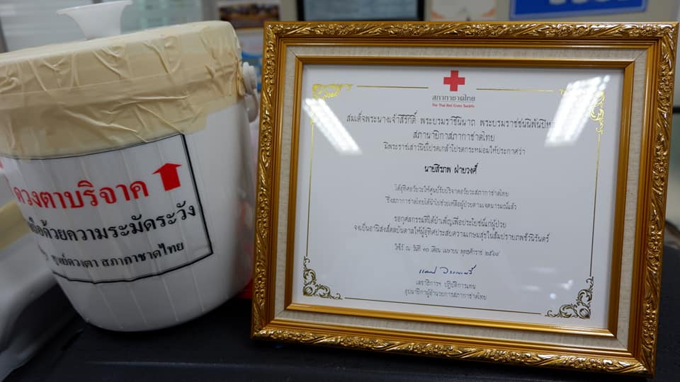 นายแพทย์กิตติศักดิ์ ฐานวิเศษ รองผู้อำนวยการด้านการแพทย์ ได้มอบเกียรติบัตรสภากาชาดไทยเชิดชูเกียรตินายสิรภพ ฝ่ายวงศ์ ให้แก่นางรัศมี แสงราช เพื้อเป็นเกียรติประวัติแก่วงค์ตระกูลสืบไป ที่หน้าห้องผ่าตัด รพ.นครพนมและช่วยขนย้ายนำส่งสนามบินนครพนม