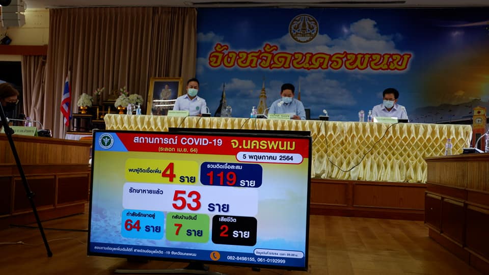 รายงานสถานการณ์ Covid-19จังหวัดนครพนม ว่า ณ วันที่ 5พ.ค.2563 พบผู้ติดเชื้อเพิ่ม 4 ราย ยอดผู้ติดเชื้อรวมสะสม 119ราย รักษาหายแล้ว 53ราย กำลังรักษา 64ราย จำหน่ายกลับบ้านวันนี้ 7ราย เสียชีวิต สะสม 2ราย